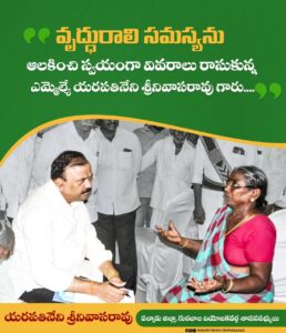 పల్నాడు జిల్లా పిడుగురాళ్ళ పట్టణంలో గురువారం మన్నెం పుల్లారెడ్డి జిల్లా పరిషత్ ఉన్నత పాఠశాలలో గ్రీవెన్స్ పూర్తయ్యాక ఎమ్మెల్యే యరపతినేని శ్రీనివాసరావు స్థానిక ఆర్ అండ్ బి బంగ్లాకు చేరుకున్నారు. ఆ సమయంలో పిడుగురాళ్ళ చినఅగ్రహారం గ్రామానికి చెందిన కొమ్మనబోయిన సైదమ్మ అనే 80 ఏళ్ల పైబడిన వృద్ధురాలు యరపతినేనిని చూసి మీతో నా సమస్య చెప్పాలని కోరగా, దీనికి స్పందించిన ఎమ్మెల్యే యరపతినేని శ్రీనివాసరావు అంత హడావుడి కార్యక్రమంలోనూ వృద్ధురాలు సైదమ్మ సమస్యను ఆలకించారు. యరపతినేని ఆమె పక్కనే కూర్చోగా సైదమ్మ చెప్పిన తన కుమారుడు ఇంట్లో ఓ గదిలో నేను వుంటున్నానని, నేనున్న గదికి విద్యుత్ సరఫరాను తొలగించి నన్ను బయటకు నెట్టేసేలా కఠినంగా ప్రవర్తిస్తున్న విషయాన్ని కన్నీటి పర్యంతమై వివరించారు. ఆమె సమస్యలు స్వయంగా యరపతినేని పేపరుపై రాసుకొని సమస్యను పరిష్కరించాలని సంబంధిత అధికారులను ఆదేశించారు.