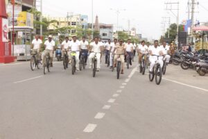 సైక్లింగ్ అనేది పర్యావరణ హితమైనదిగా ఉండటంతో పాటు, మానసిక ఒత్తిడిని నియంత్రించడంలో, శారీరక దృఢత్వాన్ని మరియు వ్యక్తిగత ఆరోగ్యాన్ని పెంపొందించడంలో కీలక పాత్ర పోషిస్తుందని జిల్లా ఎస్పీ తుషార్ డూడి ఐపీఎస్ తెలిపారు. ఫిట్ ఇండియా కార్యక్రమంలో భాగంగా పర్యావరణ పరిరక్షణ, వ్యక్తిగత ఆరోగ్యాన్ని మెరుగుపరుచుకోవడం, మరియు కాలుష్య నివారణపై ప్రజల్లో చైతన్యం పెంపొందించేందుకు జిల్లా పోలీస్ శాఖ ఆధ్వర్యంలో సైకిల్ ర్యాలీను నిర్వహించడం జరిగింది. ఈ ర్యాలీని జిల్లా ఎస్పీ జెండా ఊపి ప్రారంభించి స్వయంగా పాల్గొన్నారు. ఆదివారం ఉదయం బాపట్ల పట్టణంలోని జిల్లా పోలీస్ ప్రధాన కార్యాలయం నుంచి ప్రారంభమైన ఈ సైకిల్ ర్యాలీ కలెక్టర్ కార్యాలయం, చీలిరోడ్డు, మున్సిపల్ కార్యాలయం, పాత బస్టాండ్, గడియార స్థంభం సెంటర్, అంబేద్కర్ విగ్రహం వరకు సాగి, మళ్లీ జిల్లా పోలీస్ ప్రధాన కార్యాలయానికి చేరుకుంది. అనంతరం పోలీస్ అధికారులు మరియు సిబ్బంది యోగాసనాలు చేసి ఆరోగ్యాన్ని మెరుగుపర్చే ఈ కార్యక్రమాన్ని విజయవంతంగా ముగించారు.