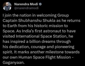 శుభాంశు శుక్లా బృందానికి ప్రధాని మోదీ అభినందనలు