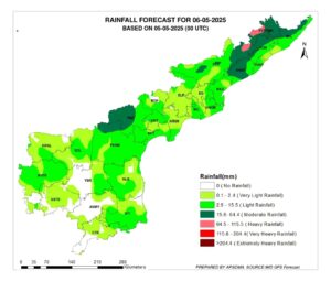 మంగళవారం (06-05-25) శ్రీకాకుళం, విజయనగరం, పార్వతీపురంమన్యం, అల్లూరి సీతారామరాజు, అనకాపల్లి, పల్నాడు, ప్రకాశం జిల్లాల్లో పలుచోట్ల పిడుగులతో కూడిన మోస్తారు నుంచి భారీ వర్షాలు, 50-60కిమీ వేగంతో ఈదురుగాలులు వీచే అవకాశం ఉందన్నారు. అలాగే విశాఖపట్నం, కాకినాడ, కోనసీమ, తూర్పుగోదావరి, పశ్చిమగోదావరి, ఏలూరు, కృష్ణా, ఎన్టీఆర్, గుంటూరు, బాపట్ల, నెల్లూరు, కర్నూలు, నంద్యాల, అనంతపురం, శ్రీ సత్యసాయి, వైఎస్సార్, అన్నమయ్య, చిత్తూరు, తిరుపతి జిల్లాల్లో అక్కడక్కడ పిడుగులతో కూడిన తేలికపాటి వర్షాలు కురిసే అవకాశం ఉందని వెల్లడించారు.