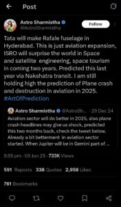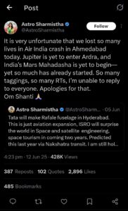 ఈ ప్రమాదాన్ని ‘ఆస్ట్రో షర్మిష్టా’ అనే మహిళ డిసెంబర్ 29, 2024లోనే ట్వీట్ చేసింది. ‘2025లో ఏవియేషన్ వృద్ధి అద్భుతంగా ఉంటుంది. కాకపోతే సేఫ్టీ, సెక్యురిటీ పరంగా ఇబ్బందులు ఉంటాయి. అలాగే, విమానం కూలింది అనే బ్రేకింగ్ వార్తలు మనల్ని కలిచి వేస్తాయి’. అని ఆ మహిళ 6 నెలలకు ముందే అంచనా వేసి చెప్పింది. అలాగే జూన్ 5, 2025న కూడా ఇదే ట్వీట్ను రీ-ట్వీట్ చేస్తూ.. ‘ఓ విమాన ప్రమాదం జరుగుతుందని.. అది విమానయాన సంస్థను 2025లో నాశనం చేస్తుందని గట్టిగా అంచనా వేస్తున్నట్టు మళ్లీ చెప్పుకొచ్చింది’. ప్రస్తుతం ఆ మహిళ ట్వీట్లు వైరలవుతున్నాయి.