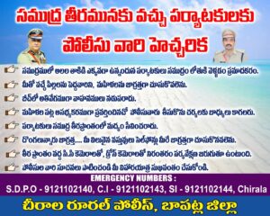 బాపట్ల జిల్లా ఎస్పీ శ్రీ తుషార్ డూడి IPS గారి ఆదేశాల మేరకు, సముద్రతీరాల్లో జాగ్రత్తగా ఉండాలని పర్యాటకులకు విజ్ఞప్తి.